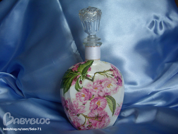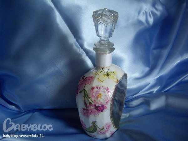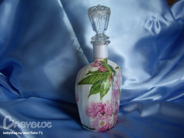 Я ее не засовывала, я приклеила ее лицевой стороной на фронтальную часть бутылки, потом покрыла ее лаком, потом нанесла белый грунт-краску, что выделило рисунок более ярко и закрасила грунтом всю бутылку оставив прозрачное окошко на лицевой стороне. Вот через него и просвечиваются вишенки, а на белую краску приклеила другую салфетку "цветущую вишню", все покрыла лаком, "начпокала" бусинок 3D контуром и покрыла еще 4-мя соями лака.