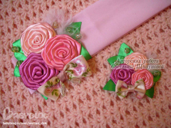 ...ну а настощие принцессы одним праздничным платьем не обходятся....:) и ко второму наряду был создан еще один комплект....также повязочка и миниатюрная брошка...Работы уже едут радовать маленькую хозяйку! :)