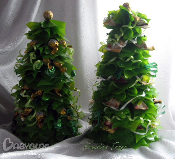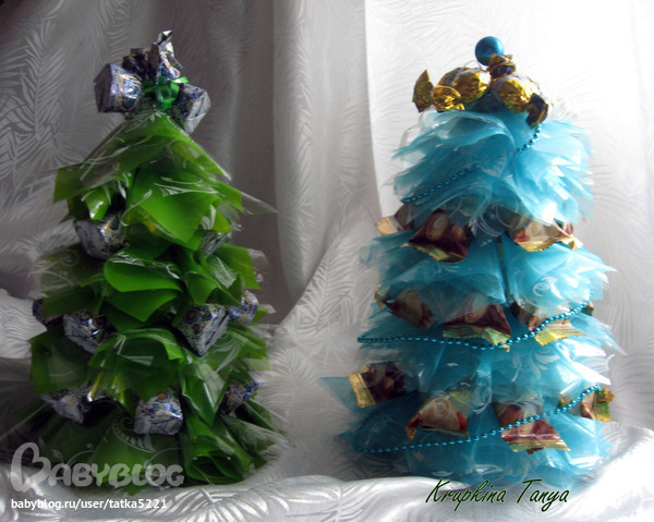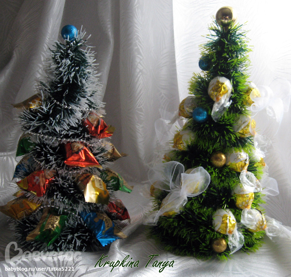 Хорошенькие елочки.Особенно зеленая с желтыми конфетами.