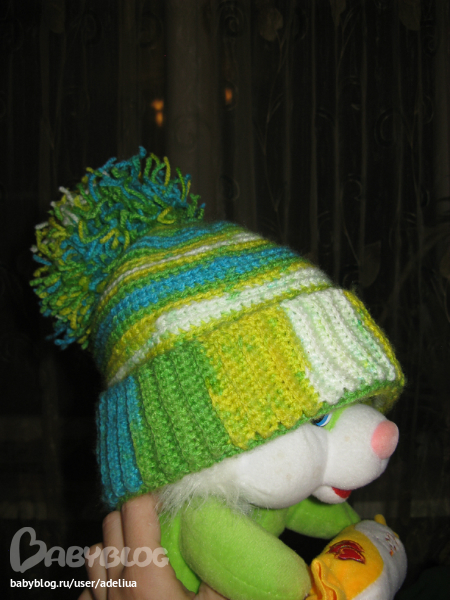 и еще вязала шапку с бубоном, фото ниже, тоже под флисовую вкладку одинарную, и расчеты делала больше, а начала шить, давит. Так может правильно сначала подклад пошить , одеть на ребенка, померять обхват и уже по нему верхнюю основу вязать?
