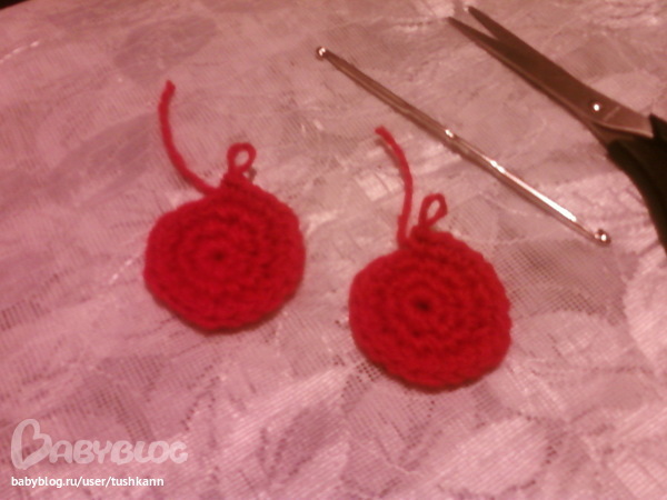 связала два кружка диаметром 5 см, носочки вязала размерчиком примерно на годик. Вяжу сразу два носочка, меняю по очереди ниточки - нигде не запутаешься - мне так легче)))