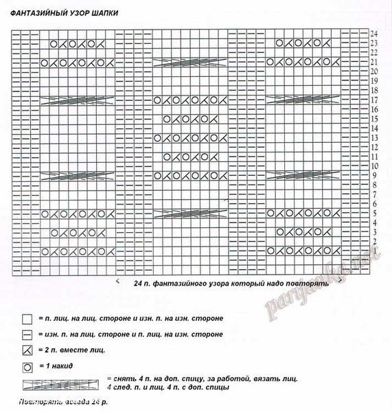 На высоте 6 см от начала, вязать спицы №7, 1 нить K1NNA и 1 нить SOPRANE, вязать вместе и вязать фантазийным узором, распределяя п. следующим образом: 3п. изн. гладью, * 24 п. фант.узором точка *,повторять 4 раза от * до *, 8 п.фантазийным узором и 3 п. изн. гладью.