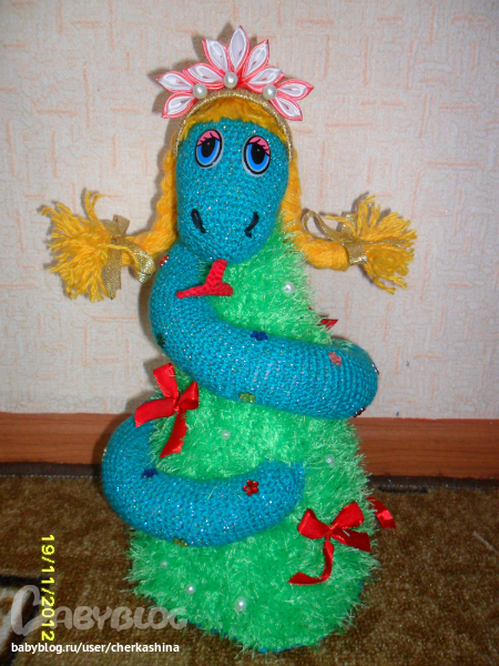 Надя,скажите пожалуйста,А вы макушку примерно какого диаметра вязали?Просто Ваша змейка,кажется крупненькой.Я тоже хочу большую,чтобы ребёнок потом с ней смог играть.И ещё вопросик:Вы проволоку вставляли?Или она у вас пришитая к ёлке?