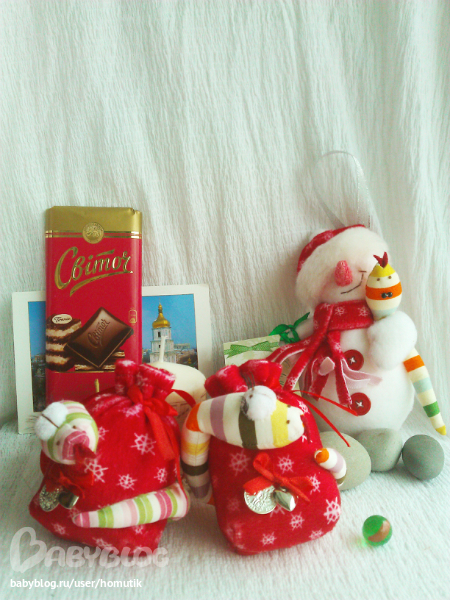 Маша . В обмен на материалы для рукоделия мне пришла целая посылка счастья!!!!! Мне понравилась чудесная девочка с бабочкой, а Маша положила еще целых два новогодних мешка Щастья и Снеговика с задорной шапкой!