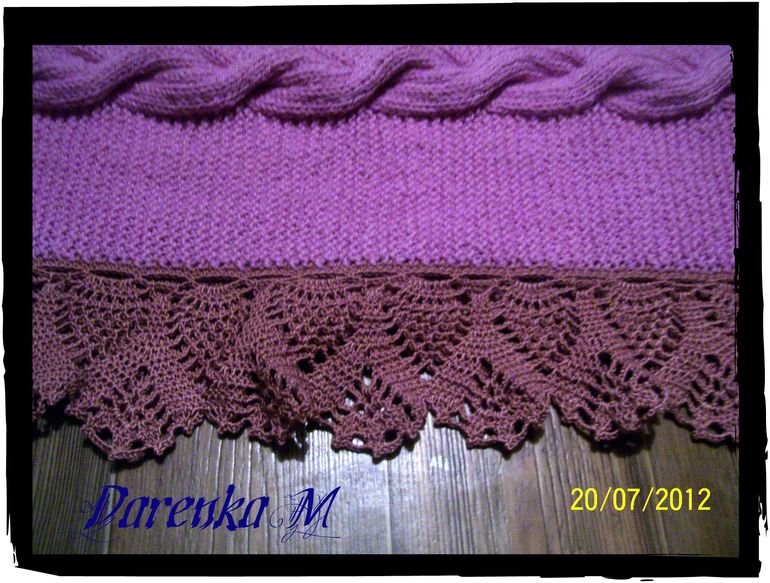 Провязать 1 и 2 ряды 11 раз, далее провязать ряд 1 (т.е. всего провязано 23 ряда), повторить ряд с перехлестом.