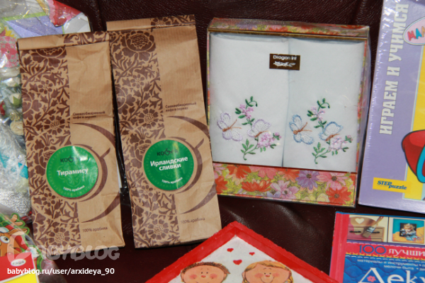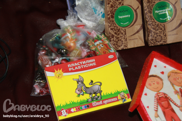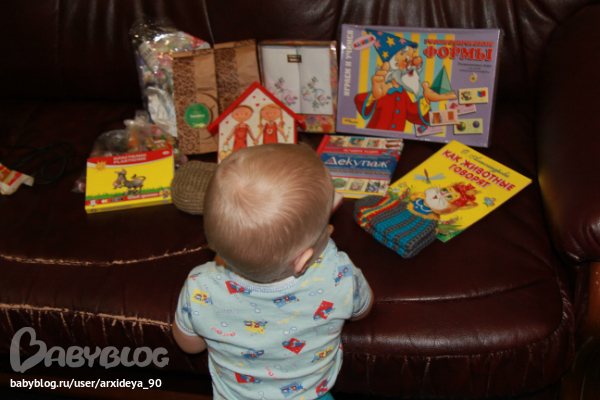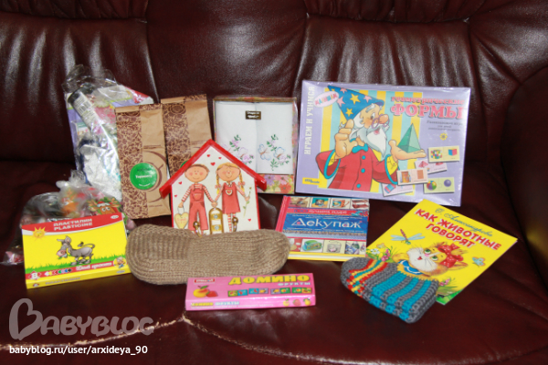 А мы вчера с Тимошкой пошли на почту отправить часть посылочек и неожиданно для нас нам сказали что нам посылочка, так классно, я как ребенок скорее домой и только сняв куртки мы с Тимохой начали разбирать посылочку, а там)))))))))) мммммммммммм богатств видимо не видимо от прекрасной ббэшечки
