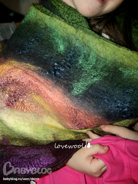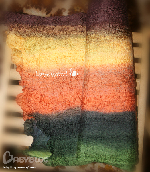 я почему-то всегда смешивала или нежные тона или близкие пог сочетанию, а тут прям хотелось буйства красок... а шелковые волокна так оттеняют и такую интересную фактуру придают палантину... прям вкусно