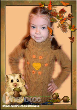 Красивый свитерок, но я бы без аппликации предпоча. А так и цвет и рисунок хороший. И доче твоей так хорошо.