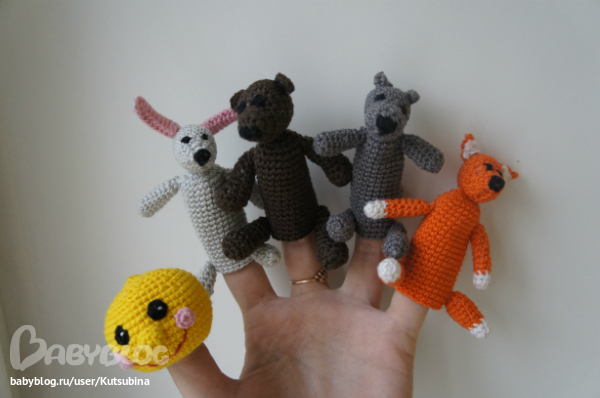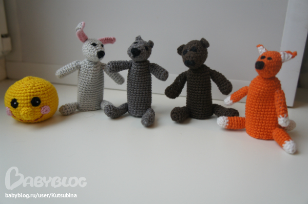 супер!!! очень симпатичные, правдоподобные!:)я вязала таких для садика , но без голов, просто глаза, морды приделывала к заготовке на пальчик, и без ног! ваш вариант очень понравился, не видела в инете такого! как голову делали не поделитесь? своих отдала уже в сад! может для своих деток сделаю еще!