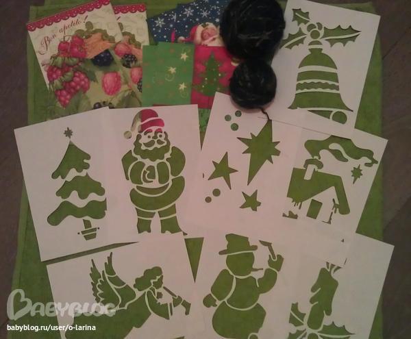 Пару моточков пряжи, салфеточки большие по 2 шт 4 вида и набор трафаретов на тему Нового года.