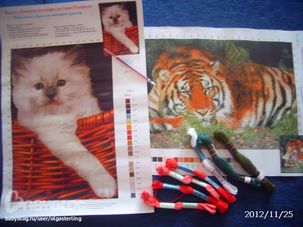 Две схемы для вышивки крестом, мулине и водорастворимый стержень.