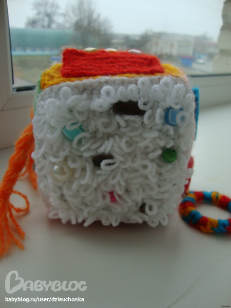 клёвый кубик!!! развивашки полезны , не важно, во сколько. сынуле 4 месяца, а ему уже оч нравится трогать все на ощупь, тянуть в рот, разглядывать))))) вот кубик все еще не сошью, вчера сшила цветик-семицветик)))) из разных тканей, с разными наполнителями...