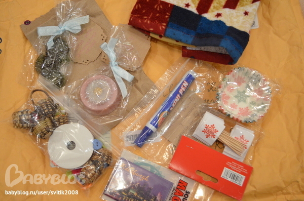 5. А это мои сокровища!!! Полотенце и магнит с символикой США (на магните потрясающая фотография штата Пенсильвания), портативный пятновыводитель, а еще бумажные формочки для новогодних капкейков (придется печь))), палочки для канапе новогодние со снежинками и пакетик для моего хомячка))) в нем пуговички, новогодняя ленточка и много-много потрясающих маленьких корзиночек, я уже придумываю куда их применить))) Они чУдные!!!!!!!! А еще самодельное мыльце, очень ароматненькое и красивое!!!