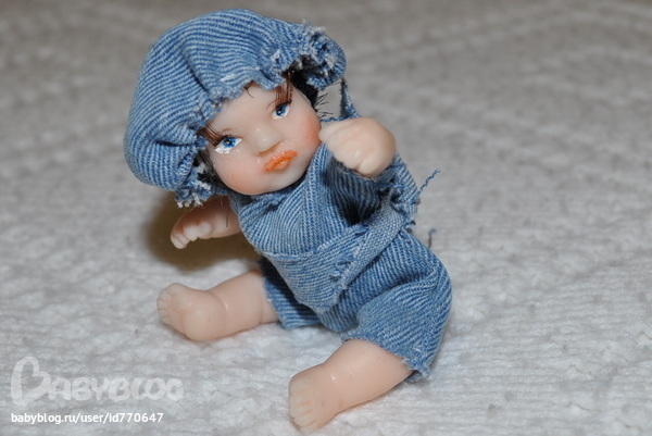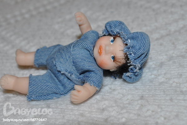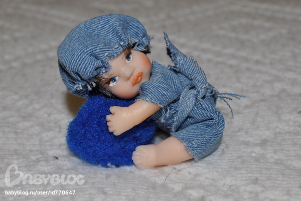 Очень хорошенький! Ольчик, начинай чуток "расти" - постарайся получше прорабатывать пальчики на ручках и ножках, с росписью личика экспериментируй: гыбки сделай не такие яркие, попробуй реснички не клеить, а нарисовать ближе к натуральным, бровками выражение другое личику придать... У тебя получится! Пробуй смелее!