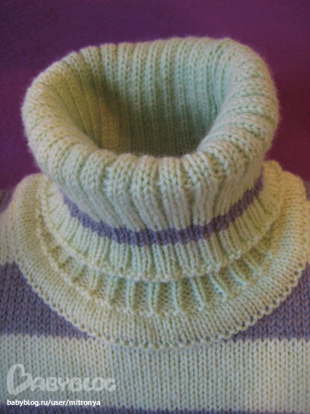 сшить правое плечо, рассчитать кол-во петель для воротника (читала, что ширина воротника должна быть меньше обхвата головы на 1-1,5 см), связала полоску из лиц петель 5 рядов, сняла с машины, прикеттлевала ее на лиц.сторону изделия, далее на изн. стороне из кеттлевочного шва набрала петли, связала 5 лиц. рядов, навесила петли от второй полоски и связала сам воротник, петли закрыла, потом сшила левое плечо и боковой шов воротника