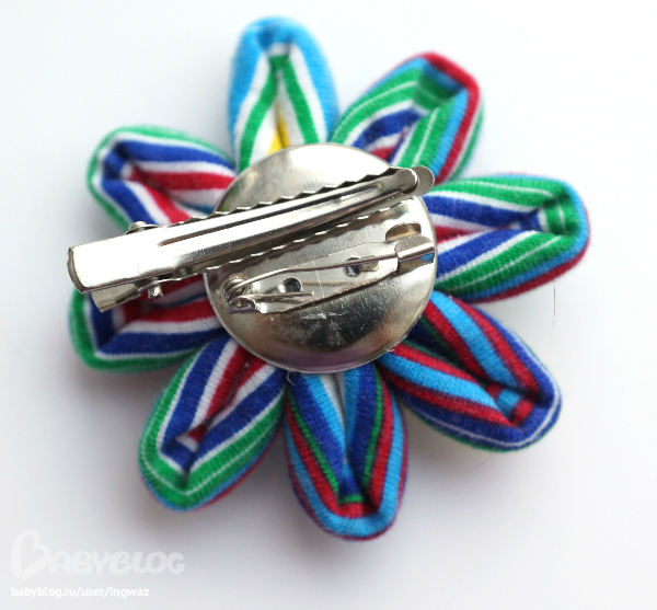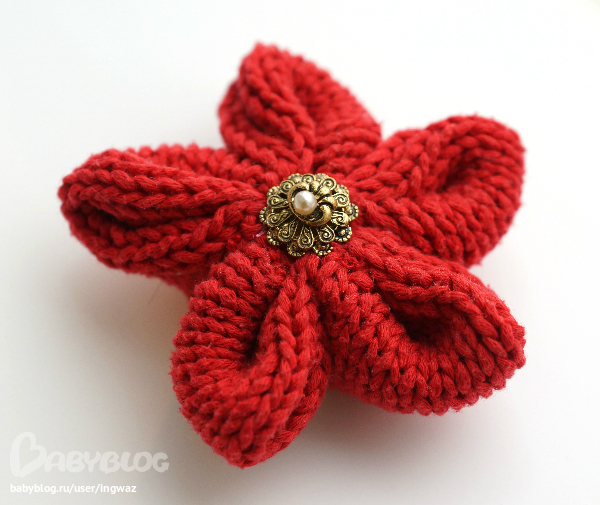 Трикотажные брошки, маленькие пришивные цветочки и большой вязаный канзаши.