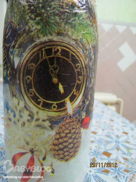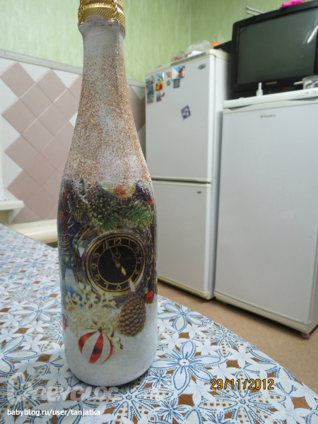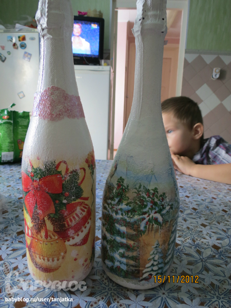 ДекупажПервый опыт в декупаже из материалов только бутылка, белый грунт, салфетка и лак))) и вот что вышло, я довольна ))) а как Вам?