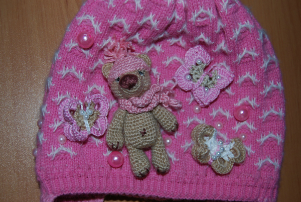 Набор: сумочка с двумя мишками, бусы и браслет с мишкой, и оформление для шапочки - мишка и бабочки. Шапка будет бежевая (розовая взята, как пример):