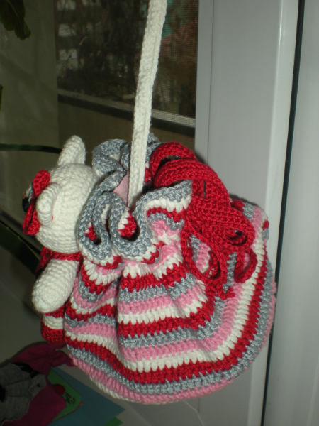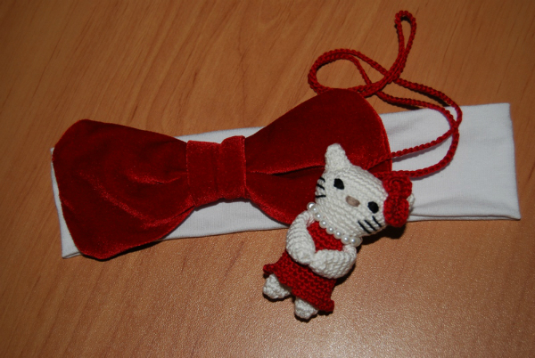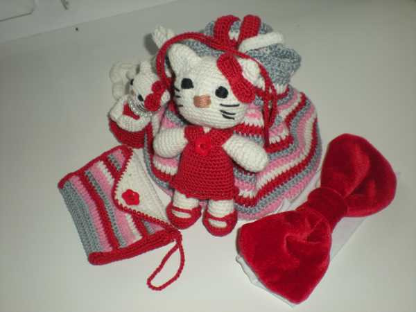 Второй набор "Китти": сумочка-бочонок с довольно внушительных размеров Китти (имеет длинную ручку и короткую), кошелёк, повязка с бантиком, как у Китти и кулон - маленькая Китти.... Имея такое "Киттиизобилие", я б сошла с ума.... ))))