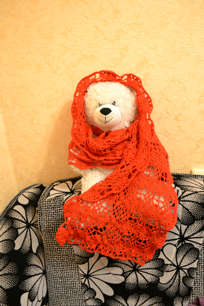 Мама попросила как-нибудь связать ей легкий шарфик на голову, чтобы она могла с удовольствием посещать церковь. Я думала, что свяжу его в РД, но вязать его оказалось так интересно, что все произошло раньше) По идее здесь еще должна быть бахрома, но, я думаю, она уже будет лишней. Использовались акриловые ниточки и крючок №2