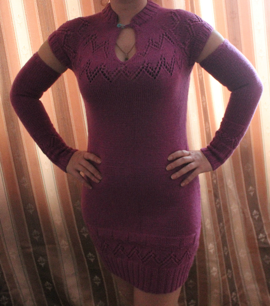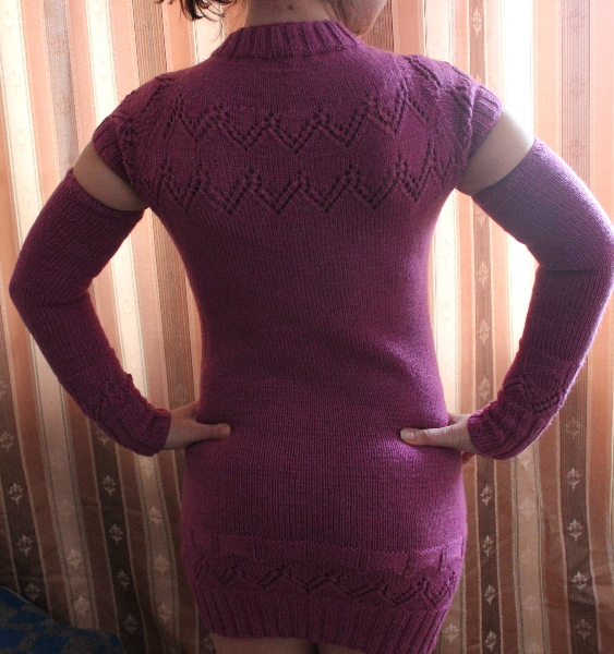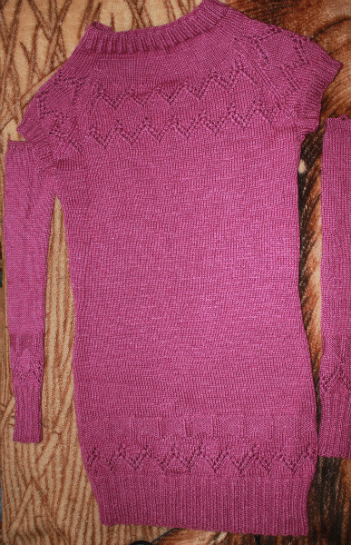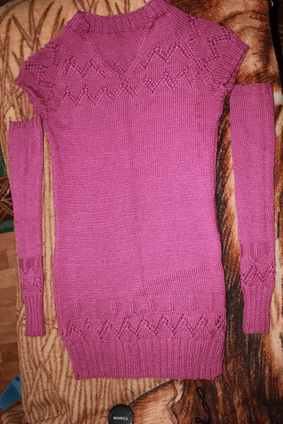 Платье- туника, для себя любимой. Пряжа "Мериносовая" -Пехорка, спицы №4. Связалось достаточно быстро, а вот дооформить уже месяц не могу(( на воротничке будет пуговица (а не маркер петель::-))) и рукава пристегиваются потайными пуговицами, чтоб не сползали -пуговки еще тоже не пришиты)) Носить можно, как с рукавами так и без))