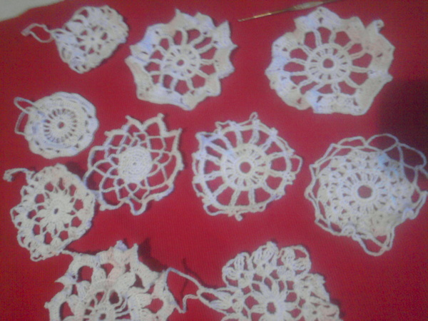 У меня не так давно был заказик. Девочка - ассистент фотографа, просила связать 55 мотивов крючком из тонких белых ниток. Я навязала, и переборщила, остались и лежат без дела. Возможно кому-то пригодится. Несколько уже с веревочкой чтобы повесить :)
