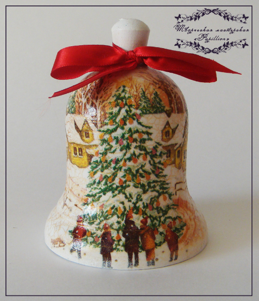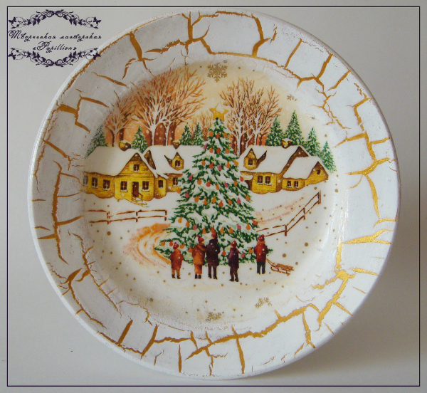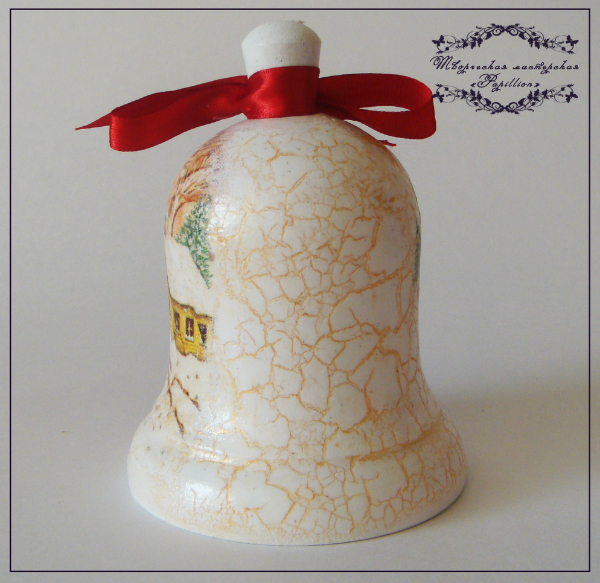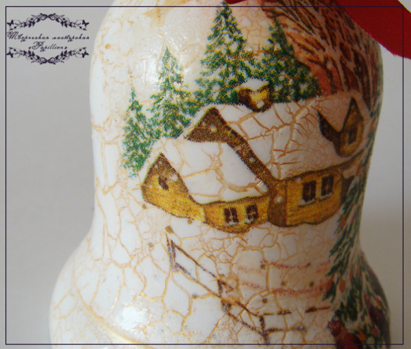 Спасибо))) на обеих работах использован 2-х шаговый кракелюрный состав Креал кракле. На колокольчике, как 2-х шаговый, т.е. сначала красите фоновой краской, потом 1 шаг, потом 2 шаг, потом затираете сухим пигментом. А на тарелке, как одношаговый: сначала золотая краска, потом 1 шаг, потом белая краска губкой, потом 2 шаг. Все нужно просушивать. А чтобы были красивые трещенки и ровное покрытие при работе с 1 шаговый кракле, 2-й слой краски надо наносить губкой. Тогда и трещенки красивые будут, и покрытие ровное