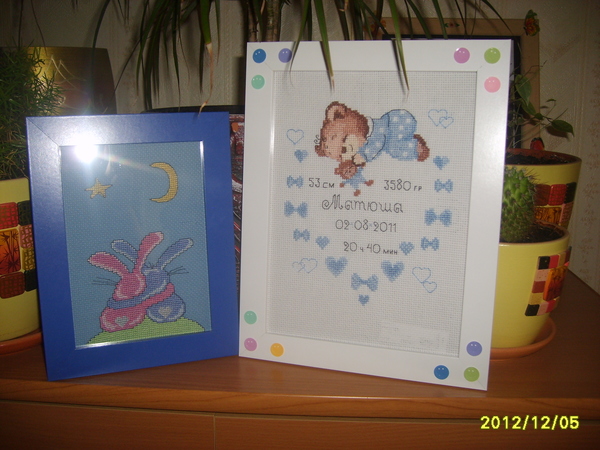 Какие классные! я все к "свиданию" присматривалась, но мне казалась простовата картинка. А в реале так хорошо смотрится, теперь точно возьму! А метрику только мечтаю вышить, наверное после окончания хлопот с НГ возьмусь ))) А рамочки в багетке такие здоровские сделали?