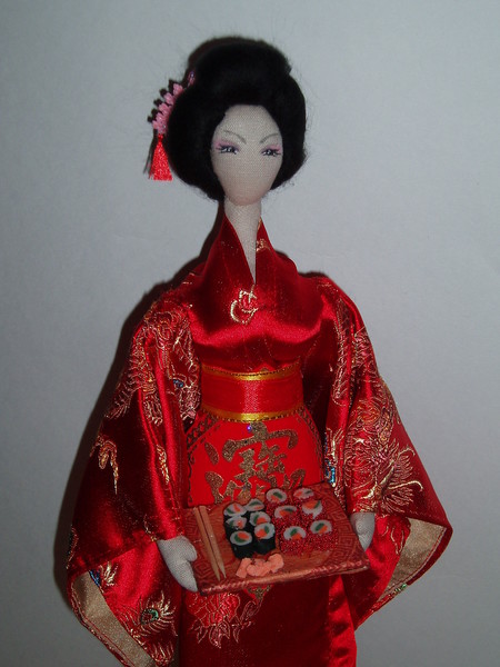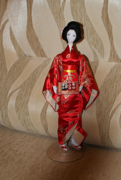 А это самое главная героиня обмена!!!!!!! Девочки я знала. что это будет куколка тряпиенс японочка, и я понимала. что она будет очень красивая ибо Галочкины тряпиенс сражают наповал!!!!!! ИИИ она очень очень красивая, настоящая!!!!!!! так все продуманно, очень сложный наряд, роллы как настоящие, прическа очень красивая, обувка!!!!!!и грудь!!!! у меня впервые кукла с грудью!!!!!!!
