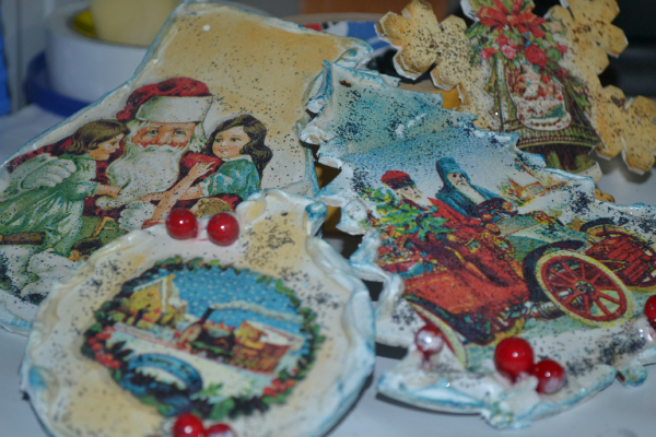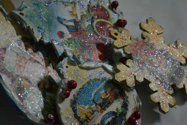 плоские простые игрушки со снежком и красными ягодками))скоро поедут на елку