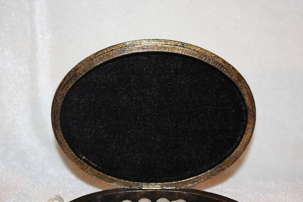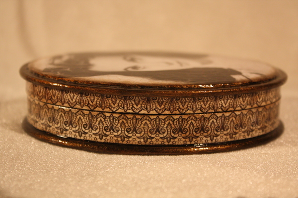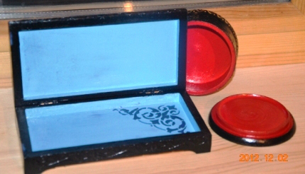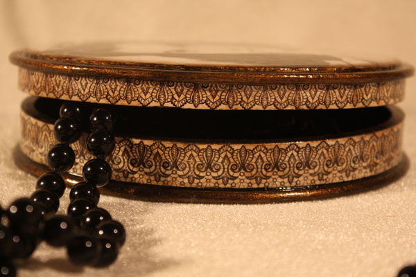 Ход работы: зашкурила шкатулку из МДФ нождачкой, далее покрыла алкидной грунтовкой, после высыхания опять зашкурила. Покрыла распечатку 3 слоями акрилового лака, замочила на 30 мин. и расслоила, после чего приклеила ее на крышку шкатулки при помощи декупажного клея и оставила сохнуть, после высыхания покрыла 2 слоями акрилового лака. На боковинки шкатулки приклеила борта вырезанные из декупажной карты (точнее пленка для декупажа) и после высыхания покрыла 2 слоями акрилового лака. На крышку нанесла кракелюрную пару Мэймори 753/754 и после высыхания затерла порошком цвета бронзы после чего смыла кракелюр под струей воды и после высыхания покрыла 2 слоями акрилового лака. Все оставшиеся части шкатулки покрыла черной акриловой краской и после высыхания нанесла по верх краски легкими мазками (использовала для затирки ватный диск) бронзовую акриовую краску, после высыхания которой покрыла все 2 слоями акрилового лака. Боковинки с приклеиными бордюрами состарила при помощи битума и после его высыхания покрыла шеллаком. А после высыхания всей шкатулки покрыла ее 2 слоями стекловидного лака. Внутри шкатулка отделана бархатом приклеиным на декупажный клей.
