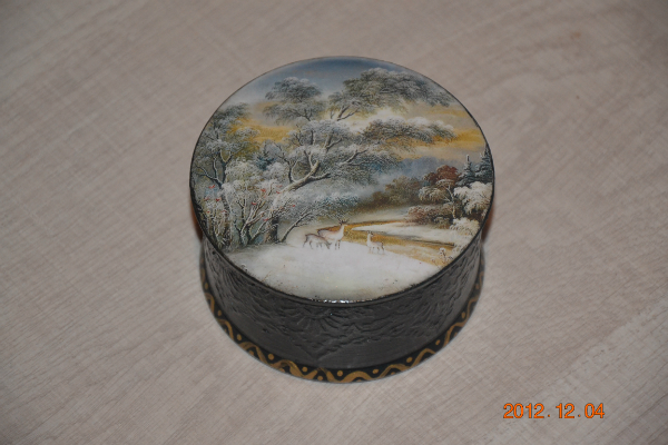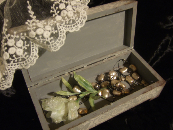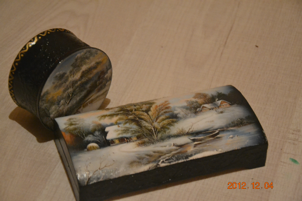 Прогрунтовала ПВА 1:1 с водой, затем 3 слоя белой акриловой краски. Приклеила мотив-распечатку. Подрисовала то что разорвалось \ отровалось. Покрасила чёрной акриловой краской боковины и нижнюю часть шкатулки. Покрыла 3-4 слоя промежуточным полуматовым лаком, сверху 2 слоя глянцевого лака.
