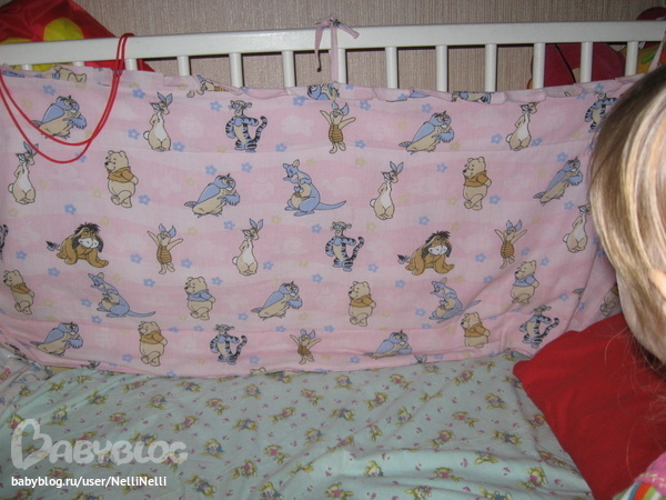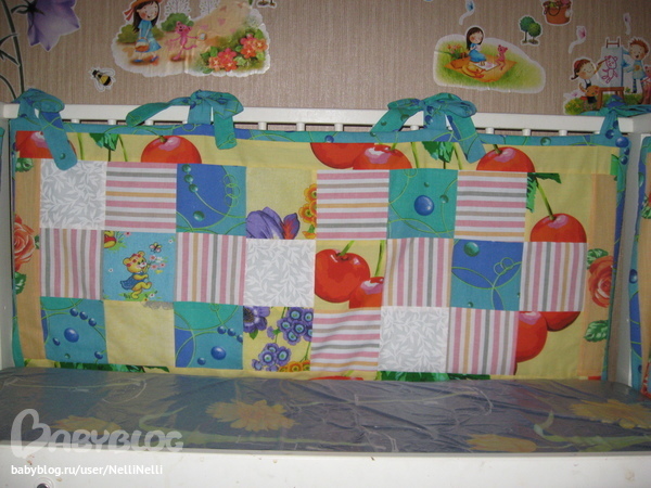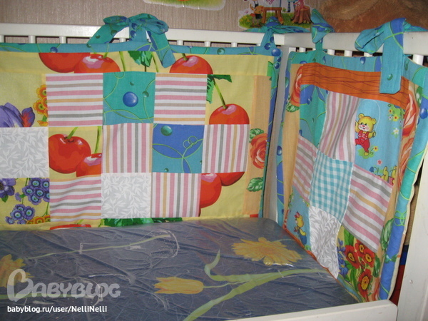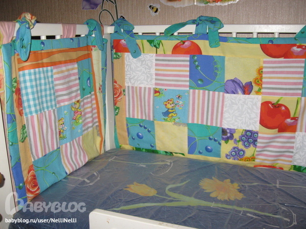 началось с того что купила специальный инструмент коврик -подложку для раскроя и роликовый нож, без которого, как оказалось, совсем никак, пересмотрела свои запасы ткани и начала творить. долго думала что же сделать (я ведь пробую), прихватки ну не серьезно у меня их миллион в стиле крейзи пэчворк.Окинув взором комнату взгляд упал на бортики в кроватке дочки, ну уж очень они вяло висят да и надоели.Решено будут бортики. ну вообщем что было