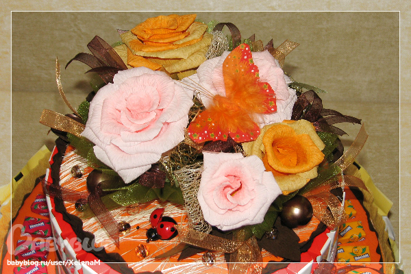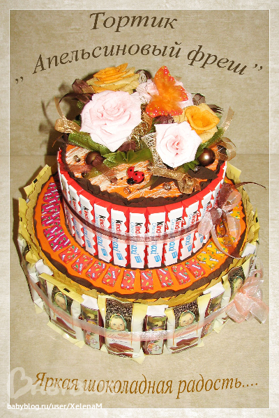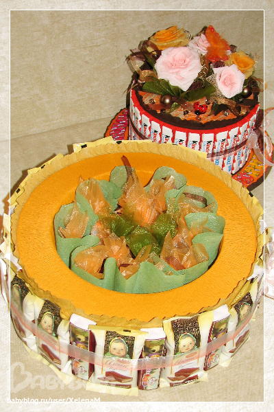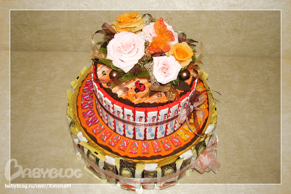 Спасибо большое! Очень приятно!!! Чтоб не было пробем с отклеиванием конфет , скотч надо к самому торту крепить одной полоской во круг коржа. Скотч тоненький 1 см. шириной. И конфеты слегка прилеплять не нужно слишком сильно их прижимать. В этом случае всё хорошо отклеивается .