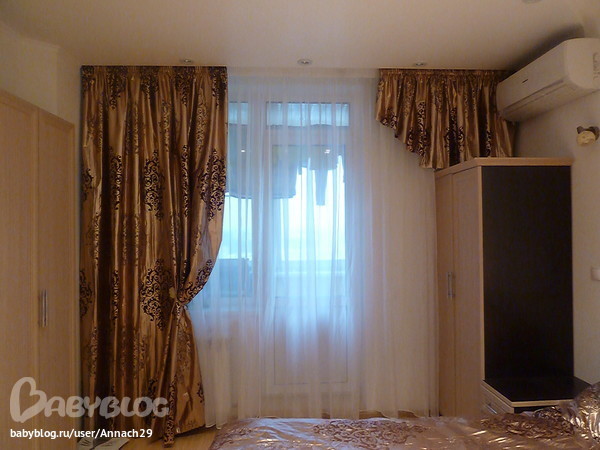 А я бы правую "штору" и сделала ламбрекеном, т.е. чтобы она шла от левой длинной шторы и до правой стены... Сделать левый край (правой шторины) немного длиннее, так, чтобы его можно было подвязать около шкафа и при этом штора будет "навесать" над окном как ламбрекен....
