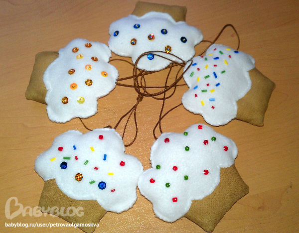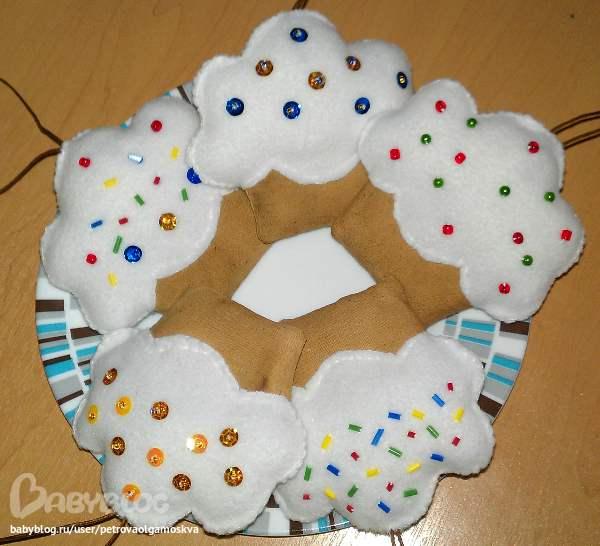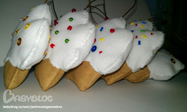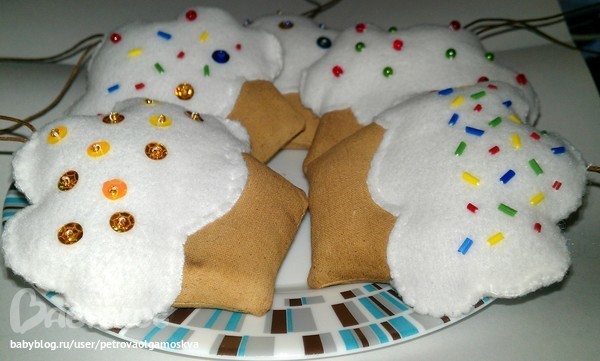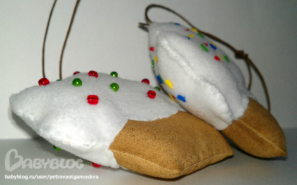 Процесс: прострачиваем, вырезаем, выворачиваем "тесто", набиваем, зашиваем, мажем смесью и сушим в духовке на слабом огне. Вырезаем "крем", нашиваем декор с обеих сторон (клей не использовала, чтобы аромат "теста"не испортить). На готовое "тесто" пришиваем "крем", не забываем про шнурок. И приятного аппетита))))