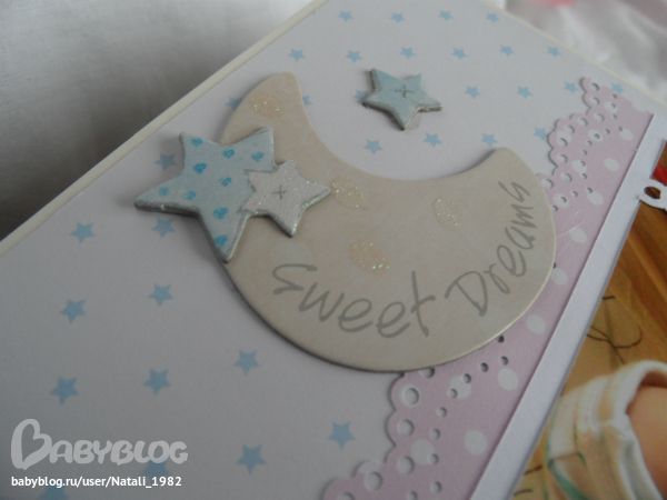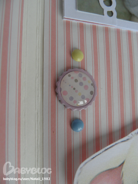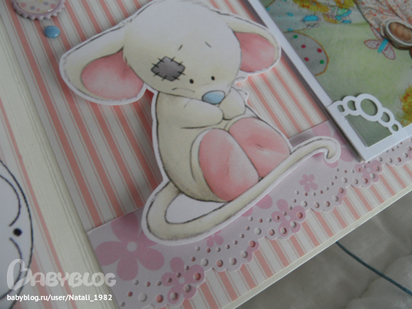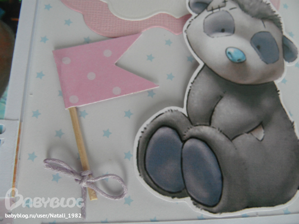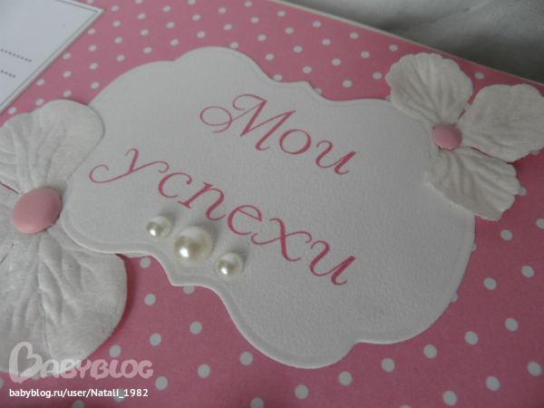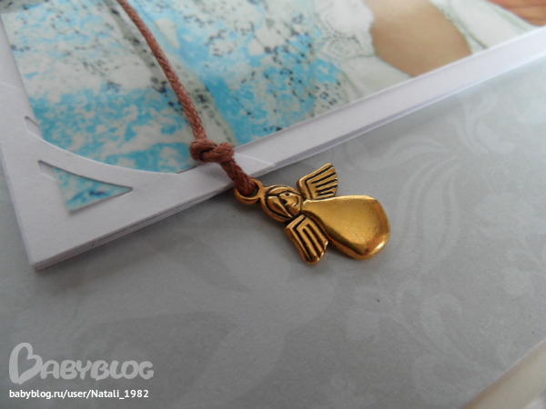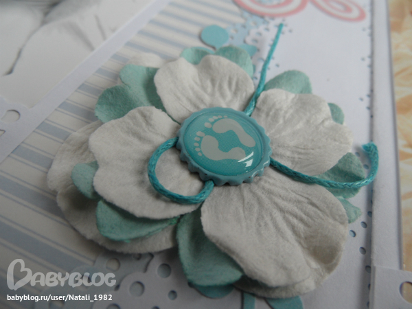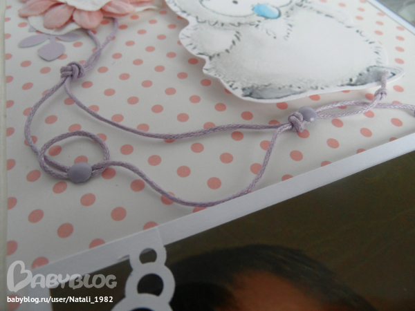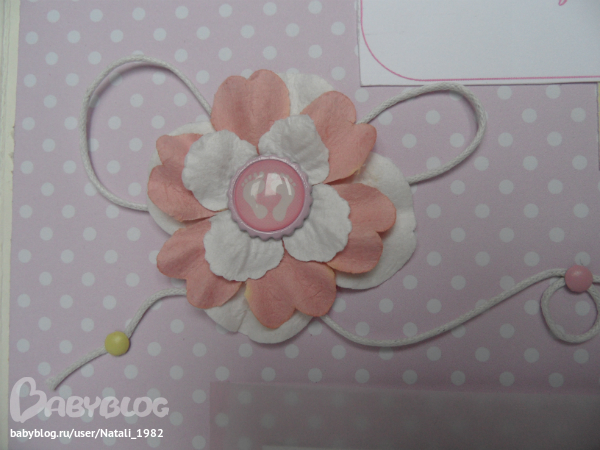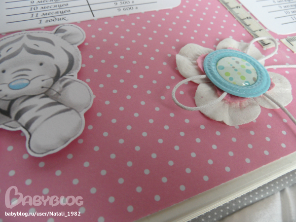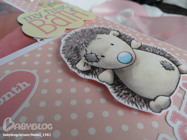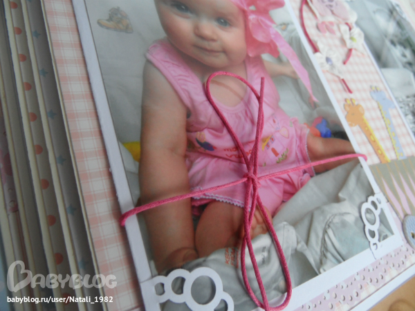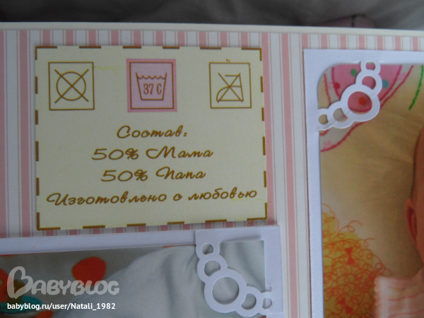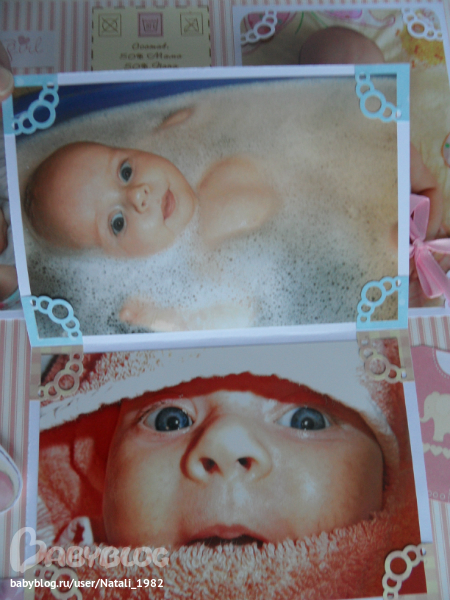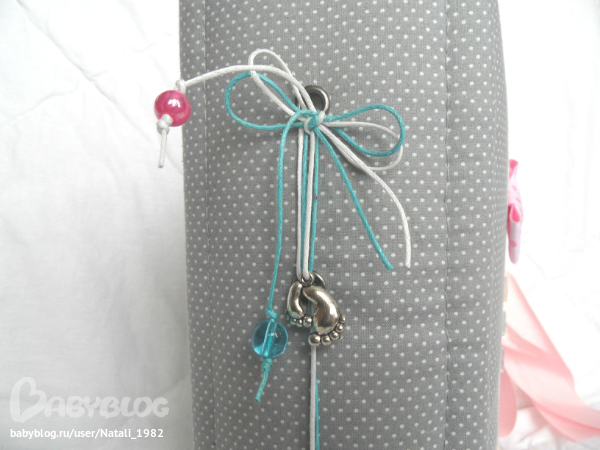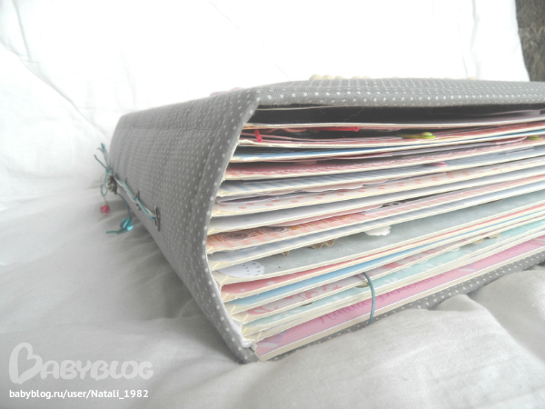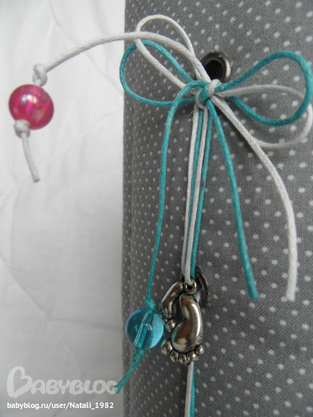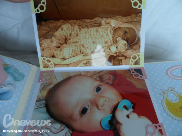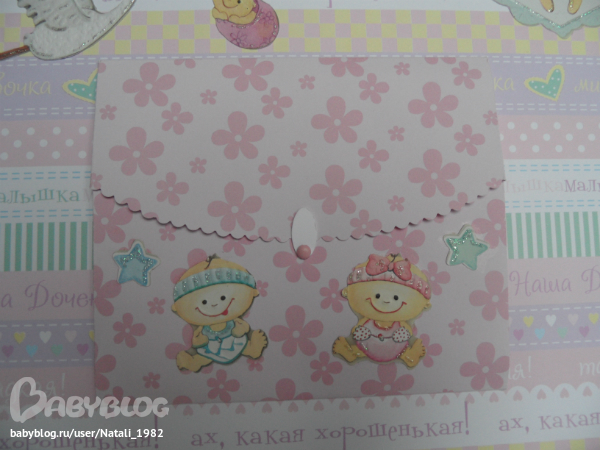 На форзаце поместила конвертик самодельный, там УЗИшечки, и прозрачный карманчик - там бирочки (да-да, в нашем роддоме до сих пор вешают вот такие страшненькие клеенчатые бирки, как у наших мам!!!)