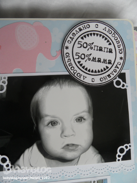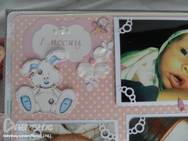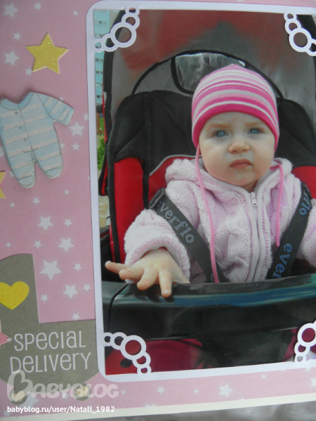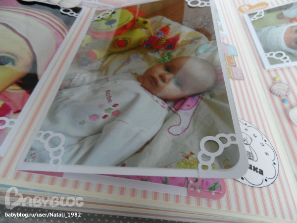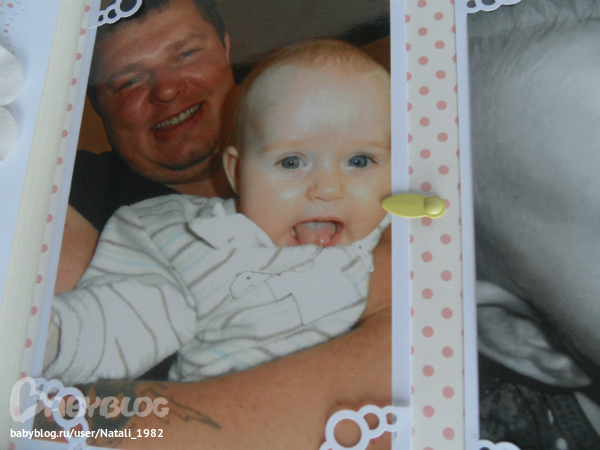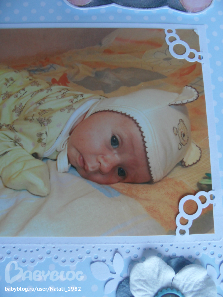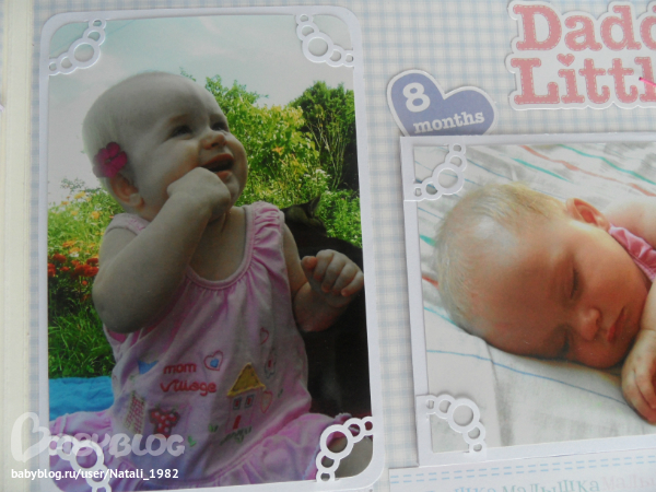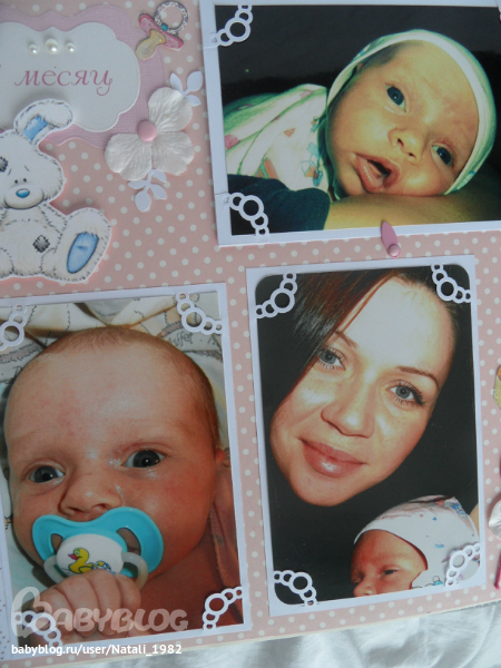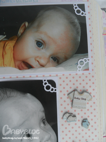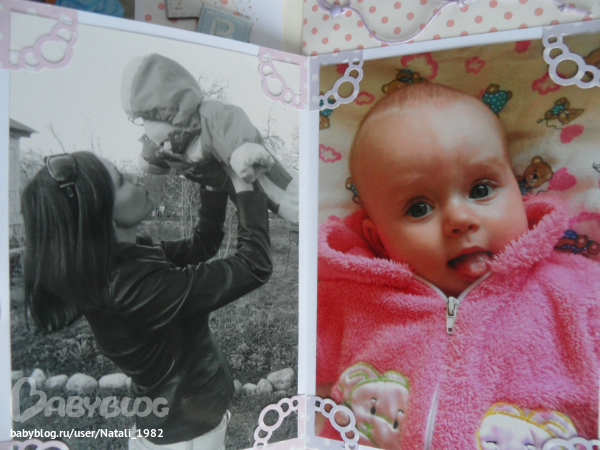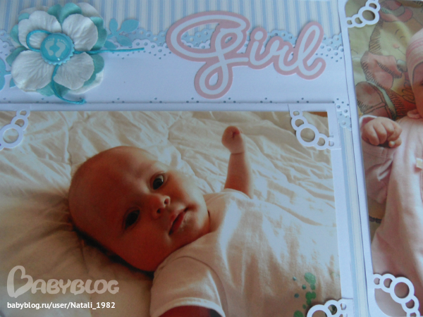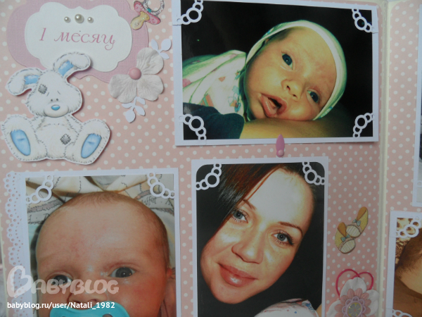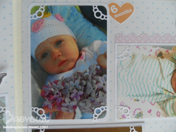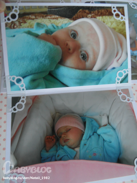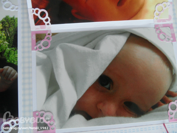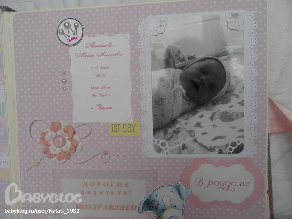 Дальше поехали, страничка из роддома. Единственная фотка, где Маруся еще в роддоме, да и та с телефона, отсюда качество (эт я, голова садовая, не взяла фотик с собой!). Фотошопила я ее, фотошопила, да не фотошопится она, пришлось довольствоваться тем, что есть.