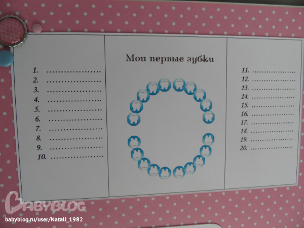 Зубки еще не подписала (представляете, первые 4 помню, когда вылезли, а остальные - хоть убей... Вроде все всегда записываю, а тут как-то не срослось, видимо. Хожу теперь, вспоминаю!!!
