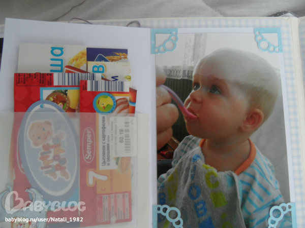 Здесь книжечка открывается, а там опять же прозрачный кармашек с этикеточками от детского питания, ну и собственно сам процесс его поедания))))