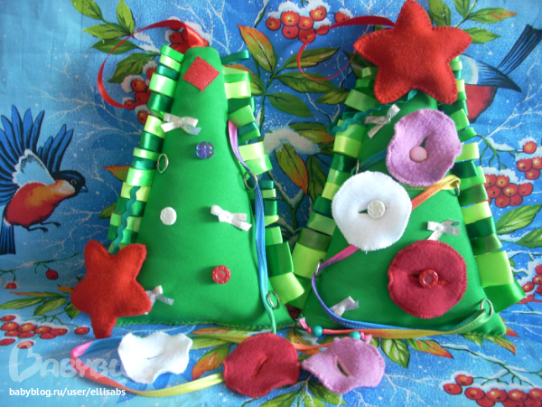 Развивающая игрушка "Новогодняя ёлочка". Идея не моя, взята из интернета. Размер елочки высота 24 см, ширина 17 см. Ткань флис (одна сторона), габардин (другая сторона), иголочки из атласной ленты, внутри синтепон. Елочку можно подвесить за тесьму. Одна сторона елки украшена бантиками, съемными игрушками "шары" (из флиса). Шары надо подобрать по цвету пуговиц и прикрепить к ним. Звезда (из драпа) крепится к елочке на липучку, также дополнительно пришита к елочке тесьмой, чтобы не потерялась. Внутри звезды погремушка. Разноцветную гирлянду (тесьма) надо продеть в колечки. На одной стороне елочки на гирлянде можно подвигать бусины, посчитать их, назвать цвета. Украшена пуговками в виде игрушек, снежинками с бисером. Все детали внутри укреплены дополнительно на пуговицы.