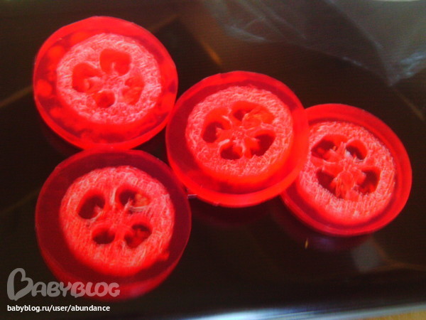 Растопила основу, вымочиа в горячей воде люфу(чтобы была мягкая) взяла бутылку из кетчупа (небыло форм) положила люффу в середину.Основу смешала с маслами медом и красителем и ароматизатором.все на глаз.Только масла нельзя переборщить а то мыло развалится потом.Вообщем все это залила.оставила начасик гдето потом вынула из бутылки (бутылка с обрезанным горлом) подсушила еше пару часов и разрезала на кусочки!