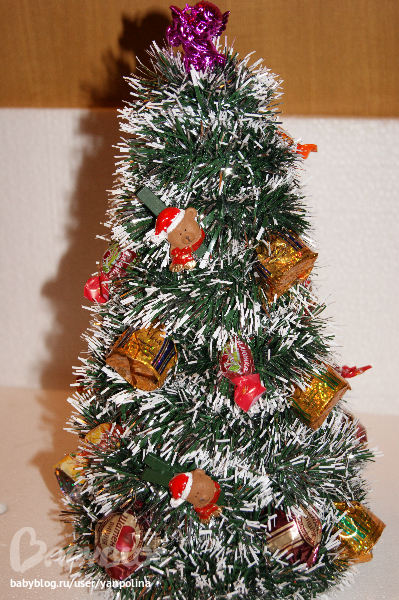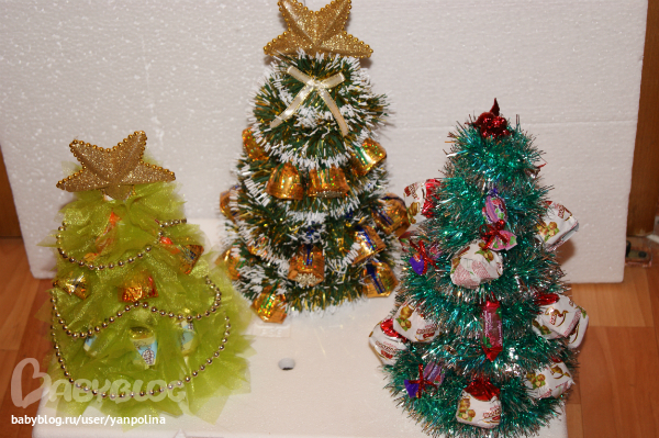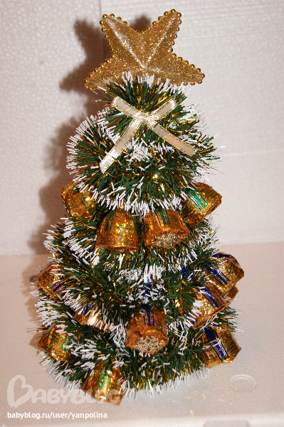 из картона делаю конус,на дно вырезаю круг из пенопласта, беру конфеты(главное сверху помельче а к низу побольше), клею их с помощью термопистолета. затем вокруг мешуру приклеиваю, и декор-это уже из елочно-новогодних запасов