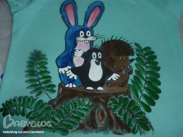 Краски Decola, специальные по ткани. Рисуешь, потом когда высохнет - проглаживаешь утюгом, потом стираешь. В коробке лежит инструкция, все написано. Только там цветов было мало, и я с коричневым, конечно, немного не догнала сначала)