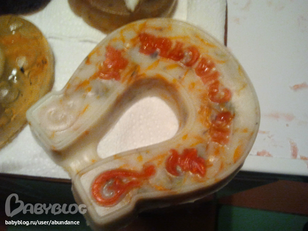 тоесть вы думаете легче сделать 1 кусочек потом уже другой. а что делатье сли какогото цвета нужно очень мало. всего пару капелек. я например делала так- разводила базу с красителем в отдельной баночке. пару капель кину в форму а остальное застывает. я потом опять разогреваю если надо. да первую партию сделала вместе-всмысле все формы сразу и прыгала как электровейник.. завтра по одной форме делать буду. и может еше вопрос вам как професионалу- если буквы на мыле очень тонкие- я из шприца лью- но наприем на подкове у меня буквы слились. как налить так чтобы было ровненько?