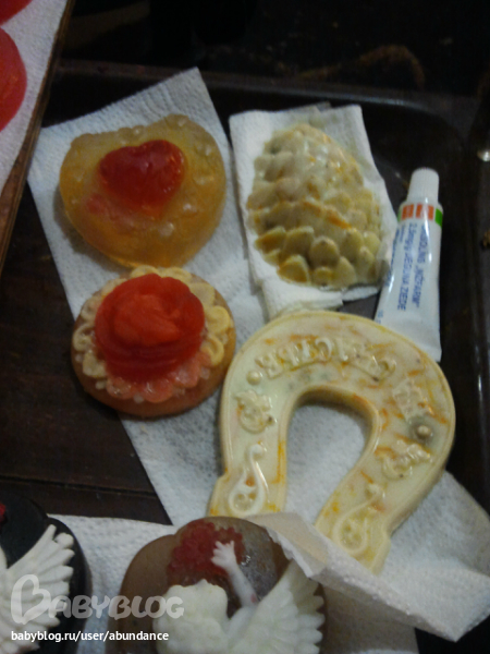 Вот Вы спрашиваете, какие помарки я увидела. Ну, по кусочкам разбирать не буду, но вот что увидела - где то поплыли слои (когда заливали следущий слой, основа была слишком горячей и подтопила предыдущий - буквы, мелкие цветочки, да и на большом цветке заметила), где-то не до конца подчистили основу (когда заливали мелкие элементы, немного вышло из края, не подчистили, а когда залили основной слой, это стало заметно). Такие ошибки типичны для новичков. Но если не торопиться. не бегать между формами, а сосредоточится на одной, то быстро научитесь делать аккуратное мыло.