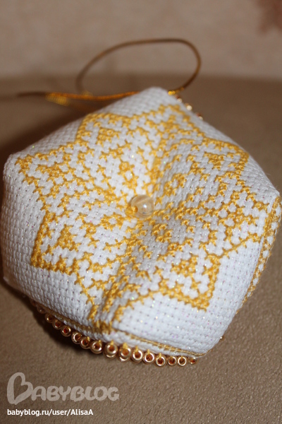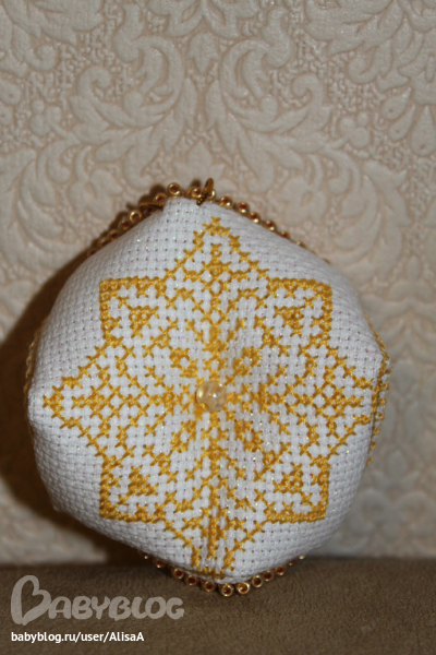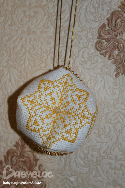 Жаль на фото не видно, но канва с люрексом, очень красиво переливается на свету. Да я ещё с расчётом немного сбилась и снежинка у меня получилась смещёной на пару клеточек... вот как-то так :)