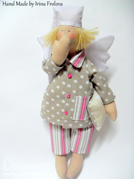 Росточком 37 см, ткань - габардин, хлопок; волосы - мохер; наполнитель - холлофайбер.