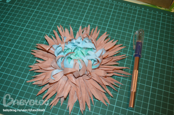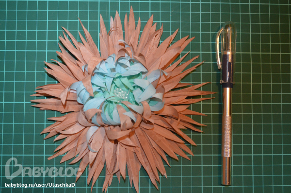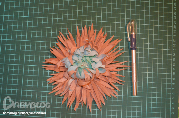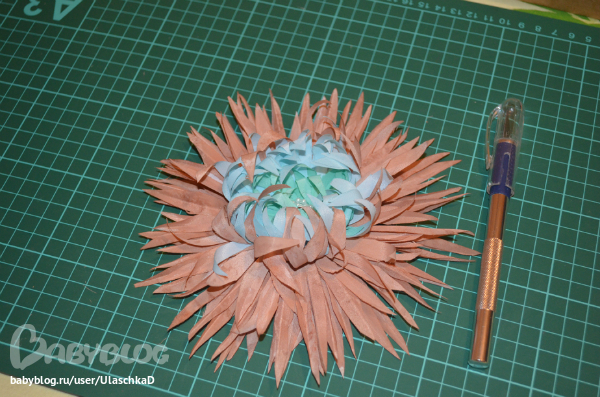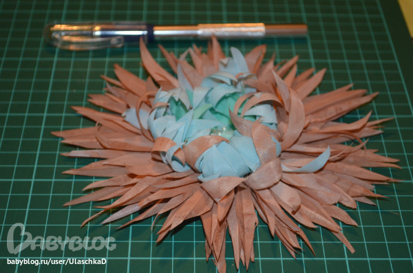мне кажется, что коричневые лепестки более закрученными если сделать, то будет лучше смотрется...либо их сделать такой же булькой, что и голубенькие лепестки, не совсем хризантема получится, но вполне красиво должно быть...
