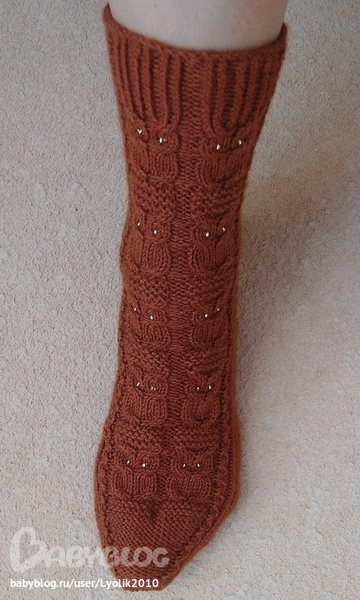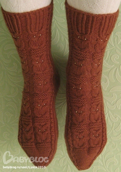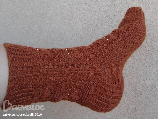 Пряжа 50% шерсть, 50% полиамид. В 50гр мотке 250м. Спицы 1,25мм, золотой бисер. Описание брала на Осинке. На носки 37 размера ушло 70грамм.